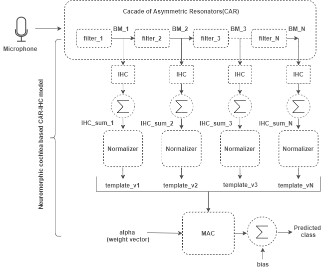 The In-filter computing performs certain amount of pre-processing of audio to extract salient features which will be used to train and test the SVM model. The audio samples passes through the CAR block which are band pass filters, output of these CAR filers are the frequency components present in corresponding filter frequency band for every sample, This component pases thrugh IHC blocks and summed for Fs samples (1 second duration), this summed energy component will be normalized in the range of 0 to 1 and this computed template output vector of normalized block after processing for every 1 second duration will be passed next to train and test the model. For different application, tunable parameters such as sampling frequency, low and high threshold of interested frquency band, number of cascaded filters and selection of range of these cascaded filters (channels) to train the model will be adjusted according to interested frequency bands of targeted classes. We use one-against-all (OAA) approach for the training. The dataset used for the training should be recorded through the microphone to generalize the effects of microphone channel in the training.