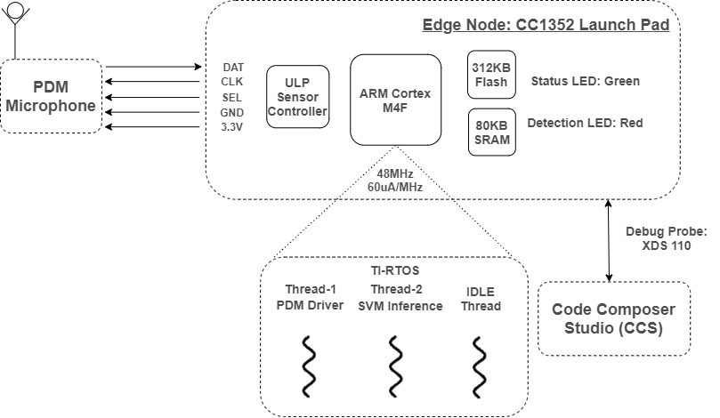 Adafruit PDM MEMS Microphone is used to capture the audio signals and it is interfaced with PDM drivers (Thread 1) and programmed to work at 1MHz sampling rate, decimated to 8KHz to get the PCM samples of the respective audio, these PCM samples are fed into accoutics classifier running on a different thread (Thread 2) using TI-RTOS. Since we have a single ARM core, these two threads are switching between each other, to eloborate, microphone collects 32 samples at one go, the accoutics classifier processes these 32 samples and goes to IDLE state before next 32 samples arrive. This process goes on real-time and after 8k samples are processed, a binary decision is made.